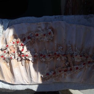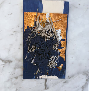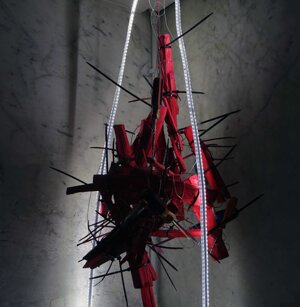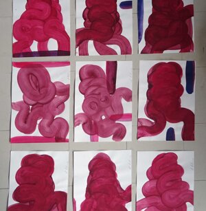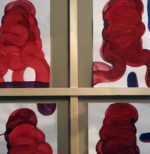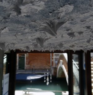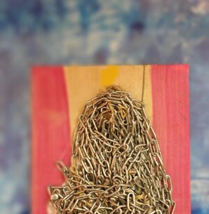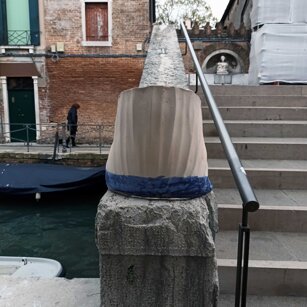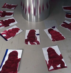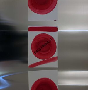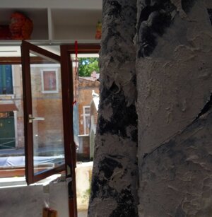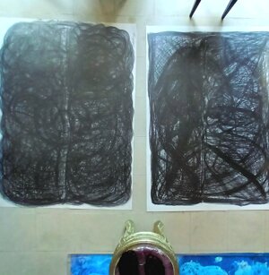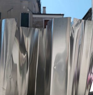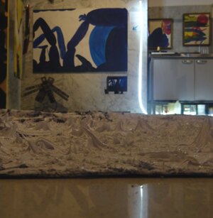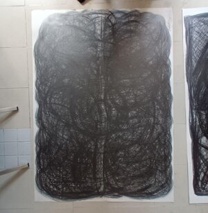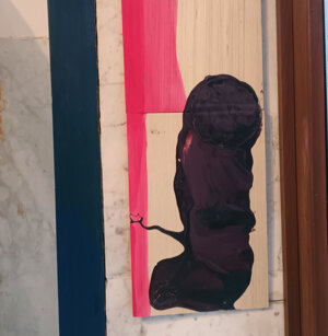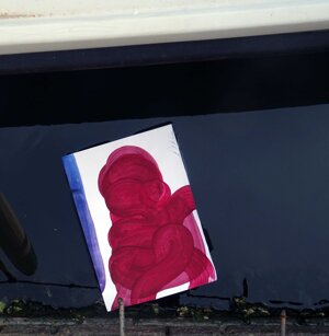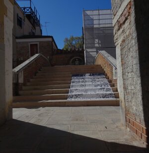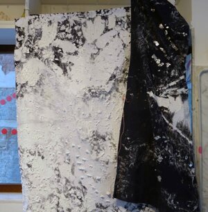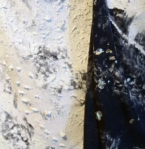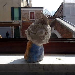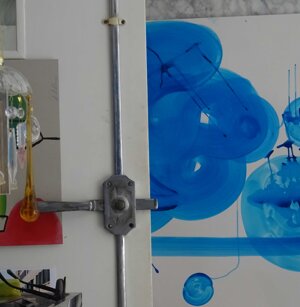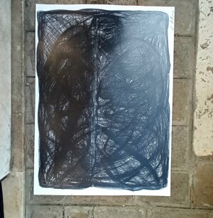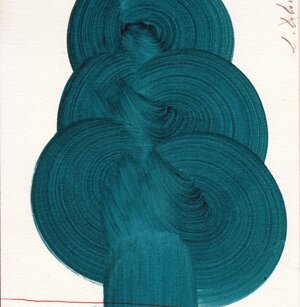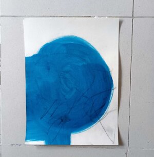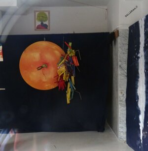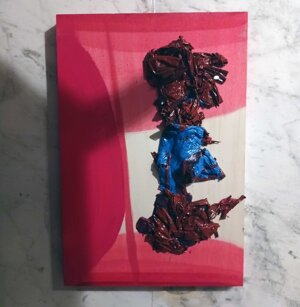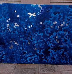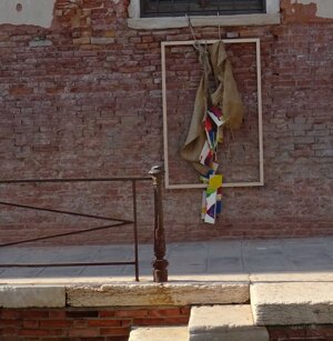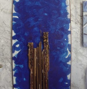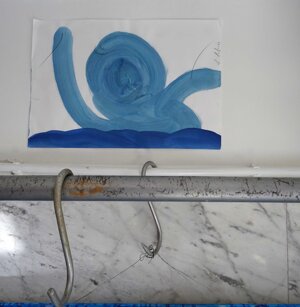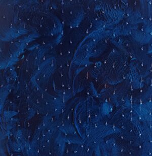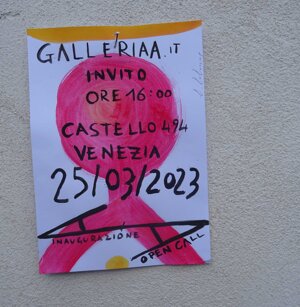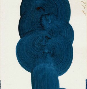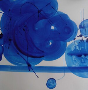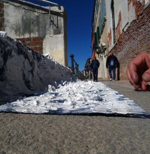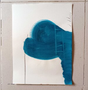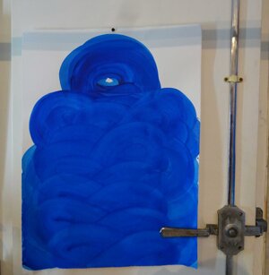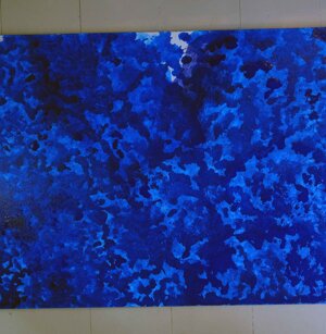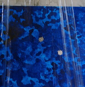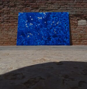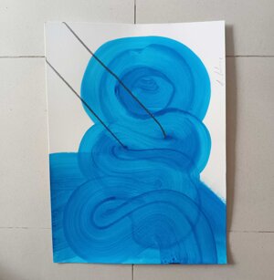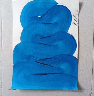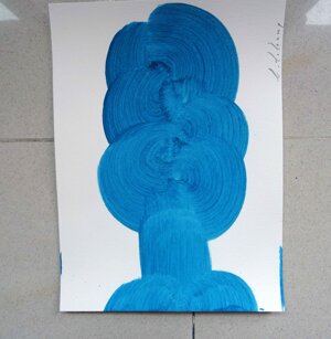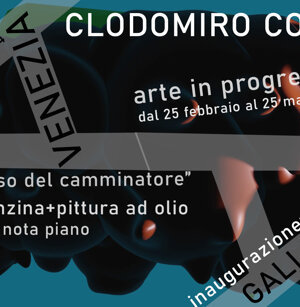 Opera in evoluzione: “iLprogresso deLcamminatore” L’opera è stata eseguita con la performance dal titolo ‘iLprogresso deLcamminatore” evento che è avvenuto dal 25 febbraio al 25 marzo. L’idea di partenza è quella di ricreare la linea che lascia il vaporetto nell'acqua. La prua e lo scafo. In poppa il bianco zinco bolle e crea verticalità nel colore, da prima spatolato poi rialzato con le dita immerse nel colore. L’odore dell’olio e della benzina: altra idea di partenza è stata quella di “impregnare” la stanza espositiva Laboratorio galleriaa con l’odore della pittura ad olio, è stato usato il bianco zinco, il colore è stato diluito con la benzina, attualità. Lo Stagno. Gocce di stagno sono state golate sul telo Blu, il metallo povero che oggi costa più dell’alluminio, attualità. In quest’opera si rigenera lo spirito del pittore/artista che come una barca solca l’acqua e disegna linee bianche a prua e bolle a poppa, creando verticalismi e schizzi nell’acqua accompagnati dal rumore vibrante dei potenti motori, ecco spiegato la benzina. Quest'ultima è stata scelta non solo per diluire il colore ma anche per un legame con l'attualità, del sentimento, della preoccupazione economica di ognuno di noi.